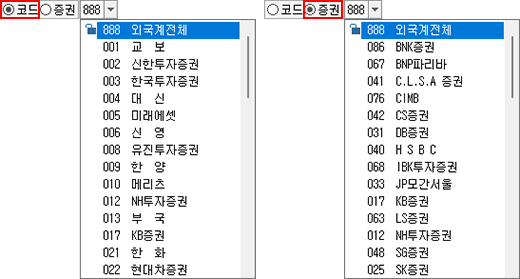 : [종목코드연계/안함] 버튼의 압정이 누름 상태가 되면 같은 그룹내의 다른 화면에서 조회 종목을 변경하더라도 해당 화면의 조회종목은 변경되지 않습니다.