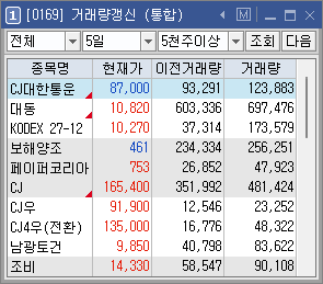 [0168]거래량급증 종목과 달리 [0169] 거래량갱신 종목은 고객이 선택한 평균 거래량 수준을 갱신한 종목을 조회할 수 있는 화면입니다.