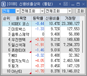 | 투자위험종목 | [위] 투자위험종목 | 신용한도초과 종목 | [신] 신용한도초과 종목 | ||