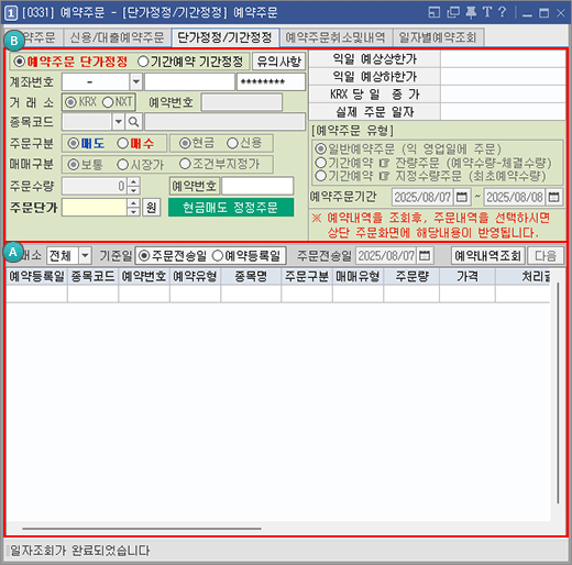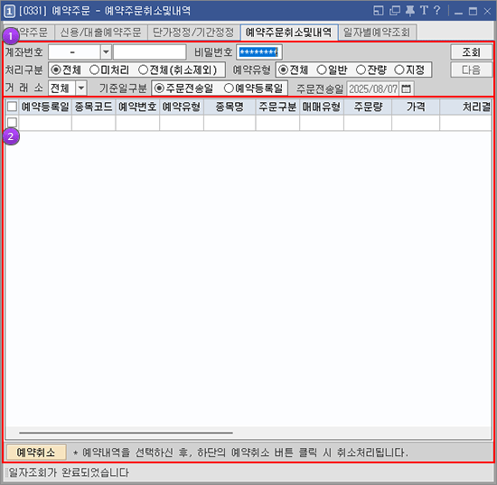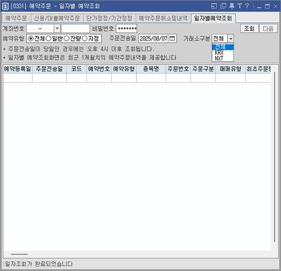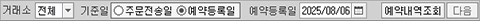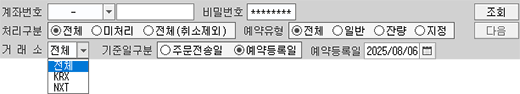[처리구분] [예약유형] [거래소] 등 조회조건을 지정합니다.ㅠ