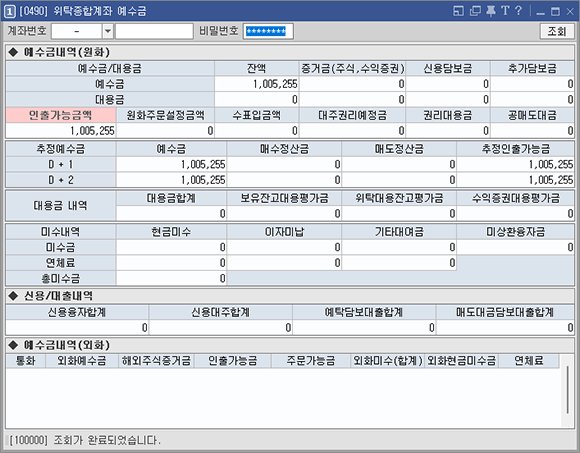 계좌를 선택하고 [조회] 버튼을 클릭하면, 위탁종합계좌의 상세한 예수금 현황을 확인할 수 있습니다.