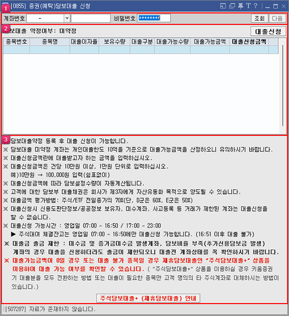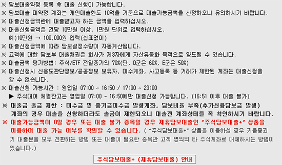 대출 신청은 [0940] 증권(예탁)담보대출안내 화면을 이용하여 담보대출약정을 등록하신 후 가능하며, 대출가능금액이 10만원이상 되어야 대출 신청이 가능합니다.