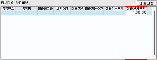 조회된 종목리스트에서 각 종목별로 [대출가능수량]과 [대출가능금액] 을 참고하여 [대출신청금액]을 입력하고, [대출신청] 버튼을 클릭하면 대출신청이 진행됩니다.
