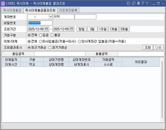 계좌를 선택하고 비밀번호를 입력한 후 [조회기간] [거래구분] [이체/대체] [조회결과표시]를 지정한 후 [조회] 버튼을 클릭하면 즉시이체 입/출금 결과를 확인할 수 있습니다.
