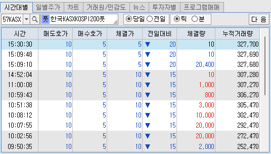 [시간대별] 탭 : 종목의 [당일][전일]의 시간대별 주가추이를 조회할 수 있습니다.
