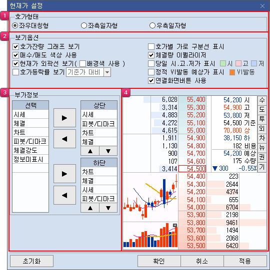 미리보기 창으로 [현재가 설정]에서 변경한 내용들이 호가창에 어떻게 적용되는지 확인이 가능합니다.