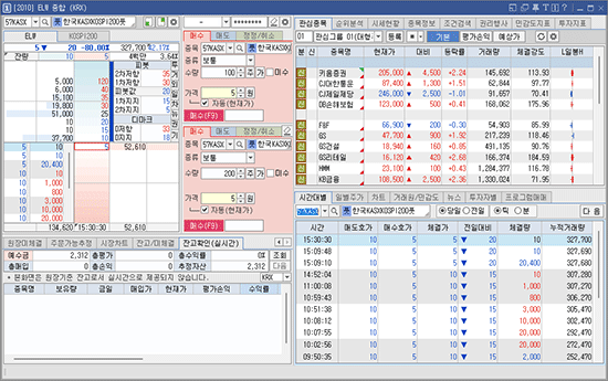 이러한 구성은 화면의 좌측면에 '주문할 종목의 시세확인 → 주문 → 계좌정보 확인' 의 매매과정을 효율적으로 사용할 수 있도록 합니다.