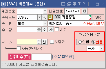 [현금] [신용]주문을 선택할 수 있는 라디오버튼 추가되어, [현금]주문 및 [신용]주문을 선택할 수 있습니다.