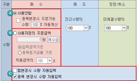 [종목변경시 주문가능수량] 항목을 선택하면 종목을 변경할 때 지정한 주문가능 수량이 자동으로 입력됩니다.