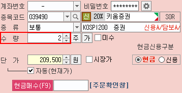 주문[단가]을 입력한 후 [가] 버튼을 클릭하면, 주문[단가]를 기준으로 매수 가능한 [수량]이 자동으로 입력됩니다.