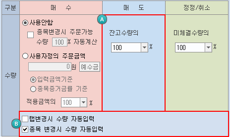 [종목변경시 주문가능수량] 항목을 선택하면 종목을 변경할 때 지정한 주문가능 수량이 자동으로 입력됩니다.