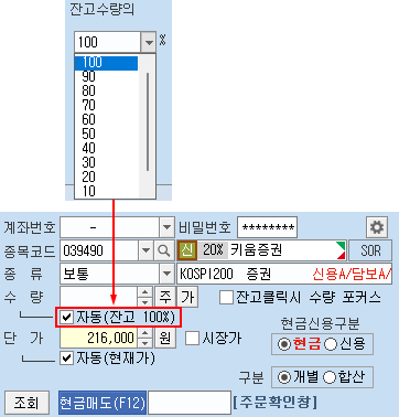 주문[수량] 항목의 [자동] 잔고%를 지정합니다.