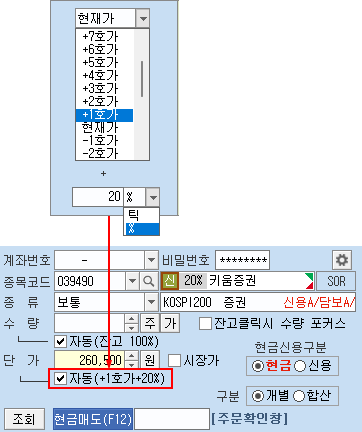 [자동(현재가)] 항목을 선택하면 해당 종목의 현재가가 자동으로 입력됩니다.