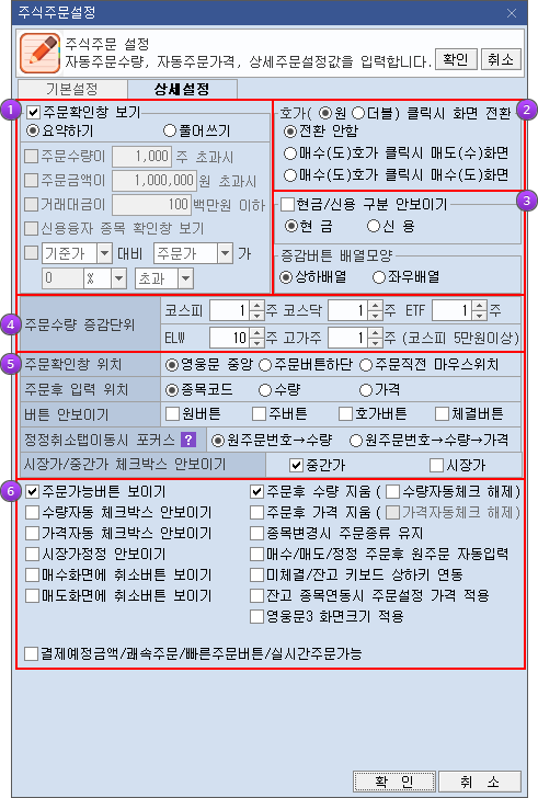 영웅문4에서 제공하는 주문화면에서는 주문수량 및 가격 등의 주문에 필요한 기초항목에 대한 설정과 '주문확인창 보기, 주문후 입력위치, 주문수량주문단위, 호가 클릭시 화면전환' 등의 사용의 편리성을 위한 환경설정을 고객이 직접 설정할 수 있습니다.