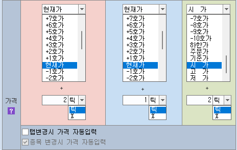 주문의 [자동] 항목에서 제공되는 주문가격을 [현재가] 중심으로 ‘±호가’ 형식으로 지정할 수 있습니다. 특히 상한가, 하한가, 기준가, 시가, 고가, 저가 등의 주요 가격을 기준으로도 ±틱/%로도 설정할 수 있습니다.