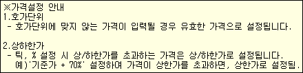 설정된 각종 설정값들은 조회종목이 변경되거나 지정된 항목에 따라 호가가 변하면 자동으로 매매 창에서 실시간으로 변동됨으로 보다 빠른 매매가 가능합니다.