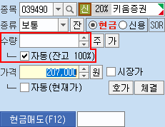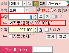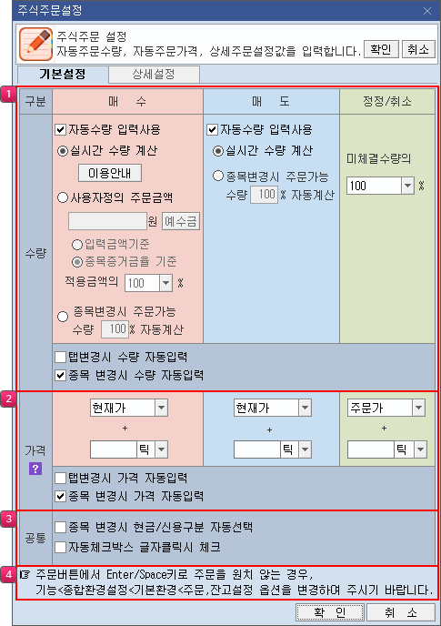 [종목 변경시 현금/신용구분 자동선택]과 [자동체크박스 글자클릭시 체크]를 지정할 수 있습니다.