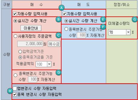 [매수]주문과 [매도]주문에서 [자동수량 입력사용] 기능의 사용여부를 설정합니다.
