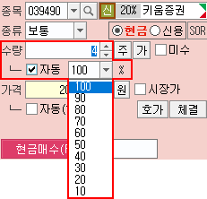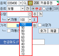 종목을 변경할 때 지정한 주문가능 수량의 %가 [매수]주문 [수량]으로 자동입력됩니다.