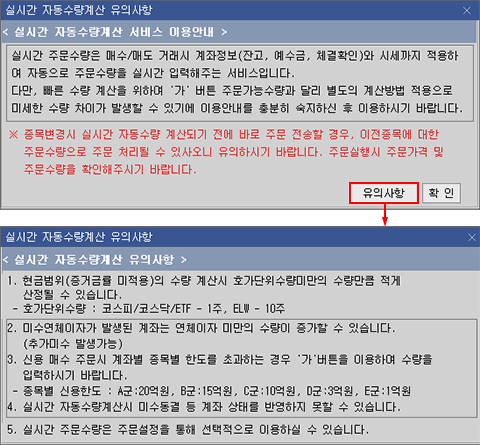 기본적인 주문 수량은 거래소는 10주단위, 코스닥은 1주 단위이나 고객 계좌의 예수금 규모와 빠른 주문입력을 위해 임의로 설정이 가능합니다.
